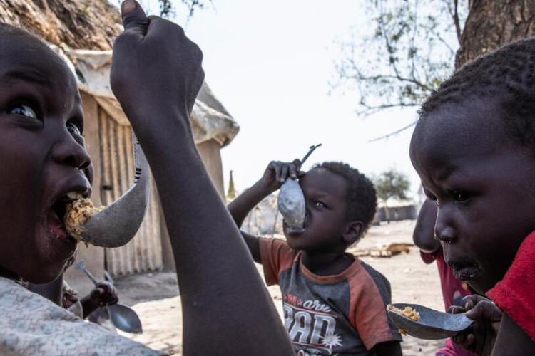 Illustrasi: WFP| Children in Fangak county, Jonglei State eat a cooked meal of sorghum. WFP provides food rations to food insecure families containing sorghum, oil, salt, peas and maize. .South Sudan 20 January 2022.